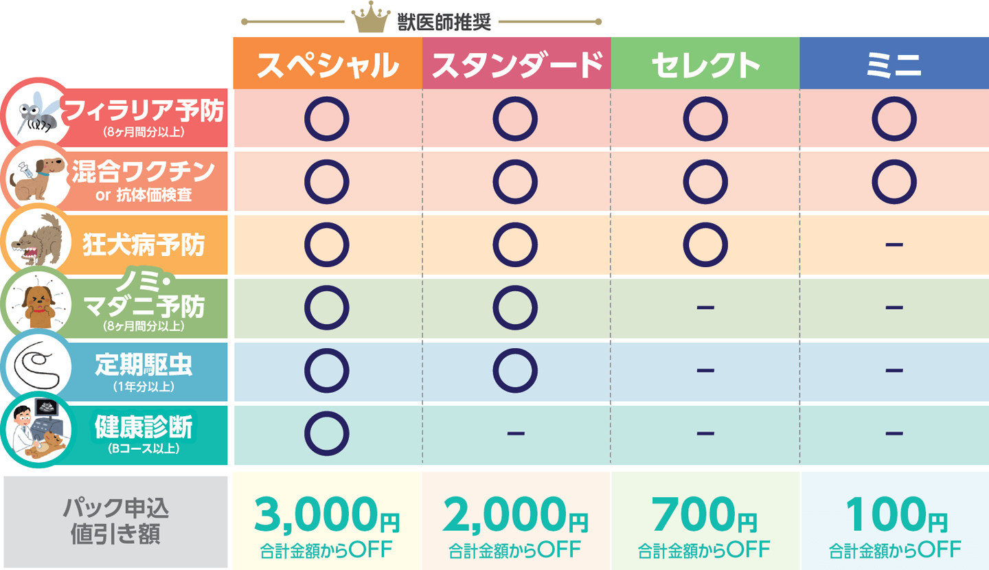 申込済のパック残りがすべて完了してからお申込みください。パック残りの有無は、お手元のスマイルパックカードをご参照ください。 - お申し込みの際は、初・再診料の他、必要に応じてフィラリア検査料金や、狂犬病予防の行政手続費用(注射済票交付手数料等)が別途必要です。